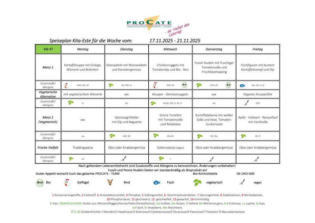 An dieser Stelle können Sie unseren wöchentlichen Plan für das Mittagessen in unseren Einrichtungen finden. Es gibt entweder das Menü 1 oder 2: